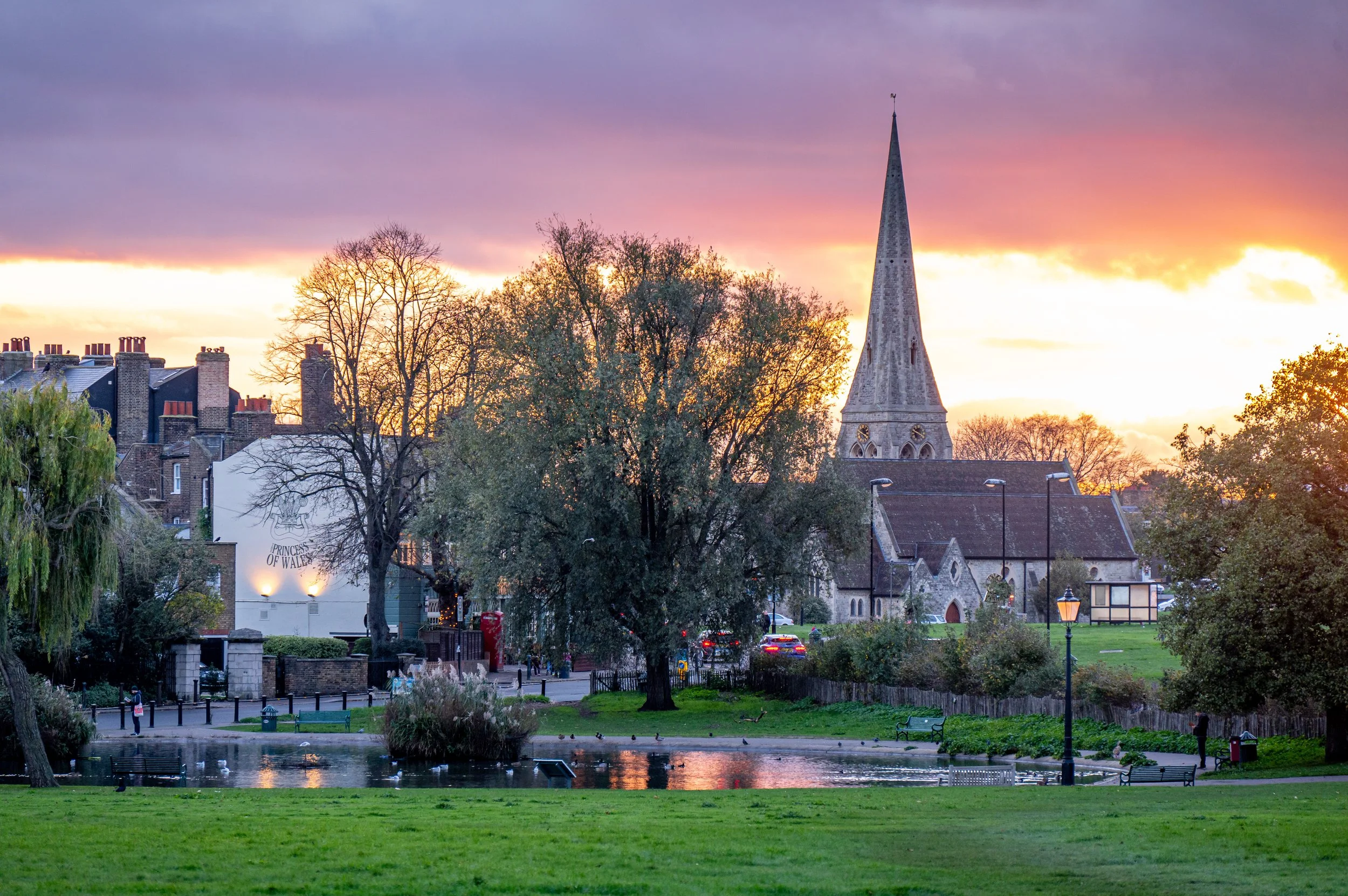 London Blackheath Village, at sunset: a timeless blend of natural beauty and architectural charm. The Victorian facades, tranquil park, and iconic church spire evoke a sense of continuity and community in this historic London neighbourhood.